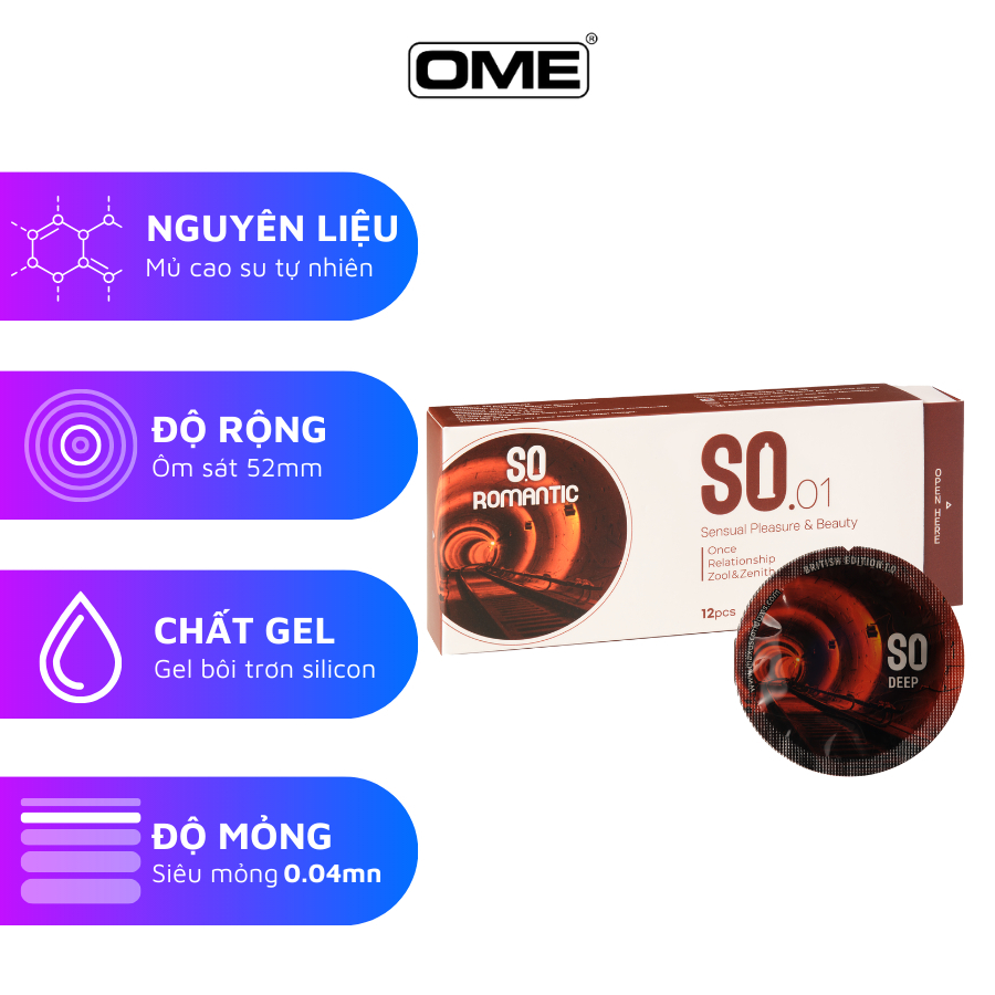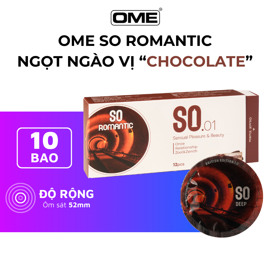 - Bao cao su SO ROMANTIC SIÊU MỎNG, HƯƠNG CHOCOLATE - HỘP 12 với đường kính 52mm, có thêm chất kéo dài, tăng cường thời gian quan hệ, bên trong bcs chứa nhiều gel bôi trơn và tăng độ cứng cáp giúp bạn điều khiển được cuộc yêu như ý muốn.